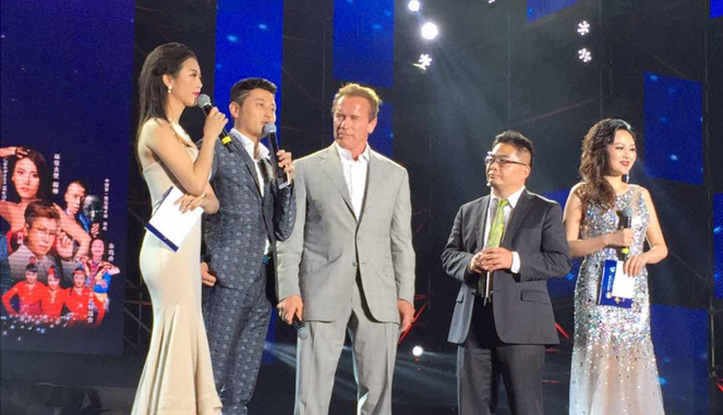 4月15日晚8时30分,四川西充县北部新城广场彩灯四溢、人山人海、鼓乐震天,一场主题为“施瓦辛格低碳中国行暨中国微电影城启动仪式公益晚会”正式拉开帷幕。会上,美国好莱坞男演员、健美运动员、前美国加州州长、政治家施瓦辛格为营山亿联总经理吴际镔授牌。